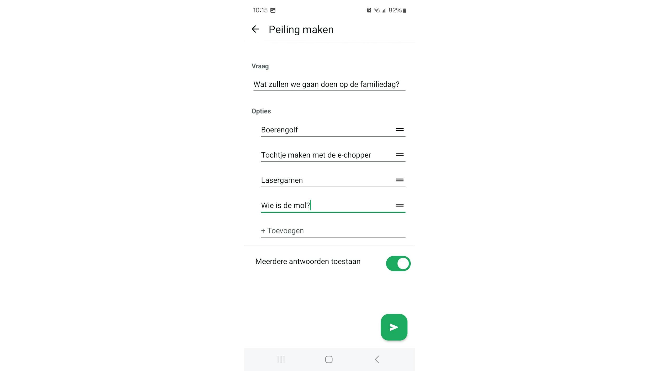 - Nu kun je de vraag en de mogelijke antwoorden invullen en de vraag versturen. Het meest gekozen antwoord komt bovenaan te staan.