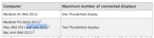 De iMac uit eind 2011 kan volgens het supportdocument worden verbonden met maximaal twee Thunderbolt Displays. De enige iMac die als iMac uit eind 2011 gezien zou kunnen worden in de iMac die alleen voor onderwijsinstellingen beschikbaar is. Dit apparaat is echter niet uitgerust met Thunderbolt-poorten, waardoor het zeer onwaarschijnlijk is dat Apple in het document op deze iMac doelt.