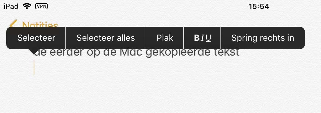 Ben je in het bezit van een of meer Macs, en toevallig ook nog een iPhone of iPad, dan is er goed nieuws. Je kunt dan namelijk heel eenvoudig gegevens op het ene apparaat kopiëren en op het andere plakken. Deze truc is bekend onder de naam Handoff, onderdeel van Continuity. Om het allemaal te laten werken is het in ieder geval noodzakelijk om op al je apparaten de laatste versie van het bijbehorende besturingssysteem geïnstalleerd te hebben staan. Is dat in orde, dan dien je vervolgens op alle apparaten waar je gegevens tussen wilt uitwisselen bluetooth in te schakelen. Daarna is het een eitje. Selecteer bijvoorbeeld op de Mac een stukje tekst en klik daar met de rechter muisknop op, gevolgd door een klik op Kopiëren in het geopende contextmenu. Of druk op de sneltoets Command-C, net wat je wilt. Open vervolgens op de iPad of iPhone (of desnoods een andere Mac in de buurt) een app die tekst kan verwerken, zoals bijvoorbeeld Notities. Tik daarin ergens in een geopend document en vervolgens op Plak. Je ziet nu de op de Mac gekopieerde tekst verschijnen.