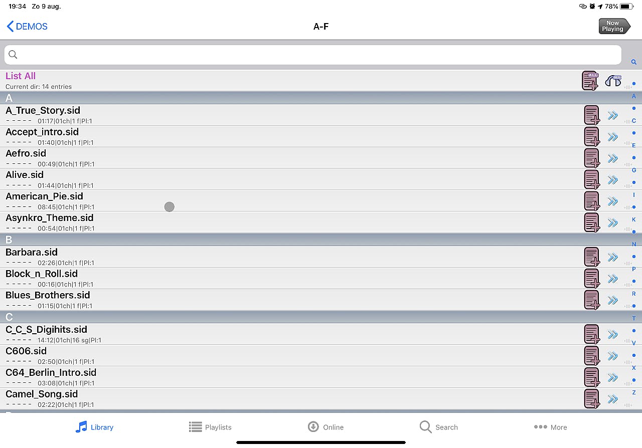 Tik op HVSC in het hoofdvenster van Modizer en dan op een van de categorieën. Blader door demo’s, muzikanten en meer en luister naar SID-muziek van weleer. Klik en go. Beluisterde (en dus ook gedownloade) tracks worden bewaard in Downloads. Onder MODLAND vind je allerlei mod-bestanden (eerst gangbaar op de Amiga, later ook op de pc dankzij de Creative Soundblaster). En onder Samples een selectie aan diverse muziekbestanden verdeeld over diverse categorieën. En verder staat niets je in de weg om vanaf het wildweide web retromuziekbestanden te downloaden afspelen. Oude tijden herleven!