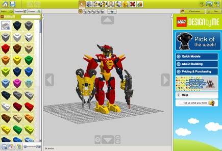 Een beetje lastig vinden we dat de handleiding en online schermafbeeldingen niet overeenstemmen met de applicatie. Online heeft men het steeds over de drie tabbladen waarin u kunt werken: LEGO DESIGNbyME, LEGO Mindstorms en LEGO Creator. Die laatste hebt u nodig om gewoon vanaf nul een eigen constructie te maken die u kunt verzenden naar de fabrikant. Een leuke optie, ware het niet dat LEGO Creator in werkelijkheid ontbreekt. Het derde tabblad verwijst in realiteit naar LEGO Universe. Na even zoeken vonden we gezochte functie toch terug in de knop Free build, dat is het witte documentsymbool met het groene plusteken.