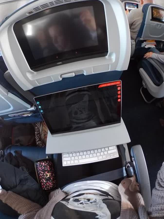 In het vliegtuig is het niet de handigste tablet van allemaal.