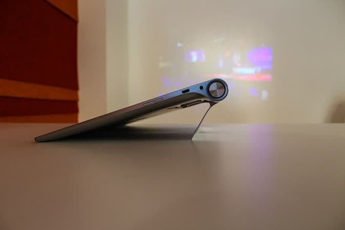 Als je de gigantische omvang negeert is de Lenovo Yoga Tablet 2 Pro best een stijlvolle tablet. Het heeft een gladde aluminium afwerking rond de randen en op de achterzijde, waardoor het er zakelijk uitziet. De naar achteren gerichte standaard is ook van aluminium, en gelukkig is hij minder lastig neer te zetten dan eerdere Yoga Tablet-modellen. Hij komt ook gemakkelijker los met een druk op een knop, zodat je hem niet meer hoeft los te pulken.