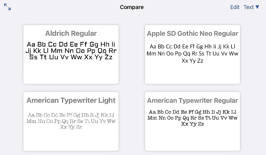 iFont beschikt verder over een de optie om geïnstalleerde lettertypen met elkaar te vergelijken, wat handig is als je lettertypen die wat van elkaar weghebben tot in de finesse tegenover elkaar te zetten bijvoorbeeld. Daarvoor is er de knop Compare. Selecteer verschillende fonts in de lijst links en ze worden allemaal als preview aan de rechterkant getoond.