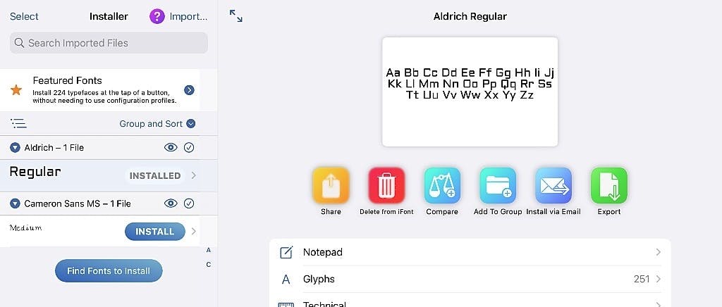 Op soortgelijke wijze kun je ook lettertypenbestanden van elke willekeurige lettertypensite binnenhalen, of deze kopiëren vanaf je pc. Hevel ze over naar je iPad of iPhone (desnoods via een mail of – mooier – via een netwerkshare en de app Bestanden) en gebruik Find Fonts to Install (of Font Finder, die knop leidt naar ’t zelfde onderdeel) en Open Files.