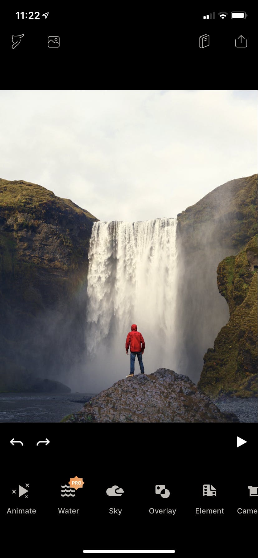 Uiteraard wil je met je eigen foto’s aan de slag. Tik hiervoor links bovenaan op de knop met het fotootje en geef Pixaloop toegang tot je afbeeldingen. Kies vervolgens New Project en selecteer een foto uit je verzameling. Pixaloop heeft enkele handige presets waarmee je in een handomdraai een extra dimensie aan je beeld geeft. Kies bijvoorbeeld een landschapsfoto en tik vervolgens onderaan op Sky. Pik er maar één van de vele voorbeelden uit. De app herkent meteen de bestaande wolkenpartij en vervangt deze door een bewegend alternatief.