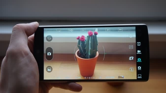 Aan de voorkant zijn er dus twee camera's geplaatst om een zo breed mogelijk veld te fotograferen. Dit is handig als je een selfie schiet met een groep mensen. Maar wel een beetje een gimmick. Dat geldt ook voor de beauty-slider die verschijnt wanneer je de selfie-camera start: deze maakt je gezicht wel heel erg plastic. Aan de voorkant tref je trouwens ook een klein zwart ovaaltje voor de autofocus. Het is best prettig dat dit voor de front-camera ook beschikbaar is.