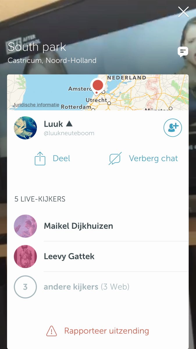 Op die manier laat je aan de filmer blijken dat je de beelden waardeert. Je ontdekt eenvoudig wie er nog meer live meekijken met de video. Veeg in de iOS-versie naar rechts of in de Android-versie omhoog. Gebruik de optie Verberg chat om de gesprekken te verbergen.