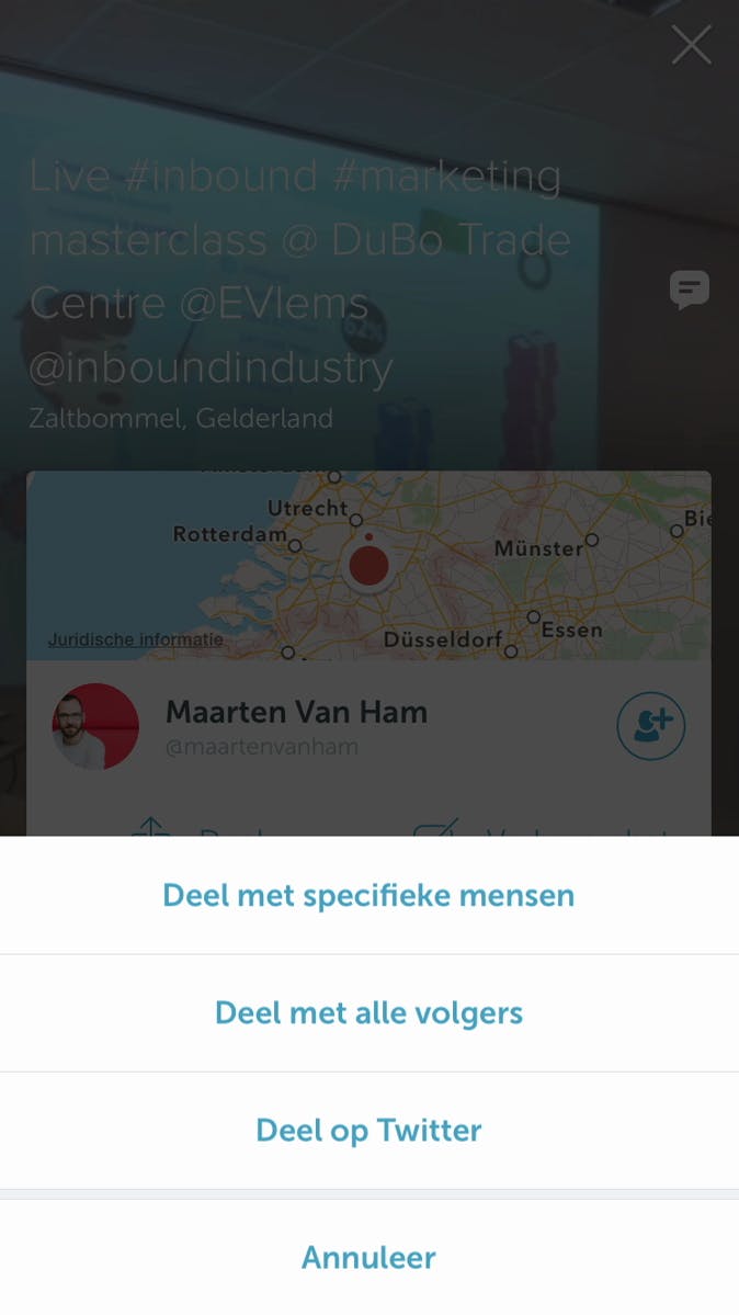 Zodra je drukt op Deel, heb je keuze uit verschillende opties. Via Deel met specifieke mensen geef je aan onder welke volgers je het filmpje wilt verspreiden. In plaats daarvan kun je ook kiezen voor Deel met alle volgers. De derde mogelijkheid is Deel op Twitter en is alleen beschikbaar op een iPhone. Hiermee publiceer je een hyperlink van het filmpje op dit sociale netwerk.