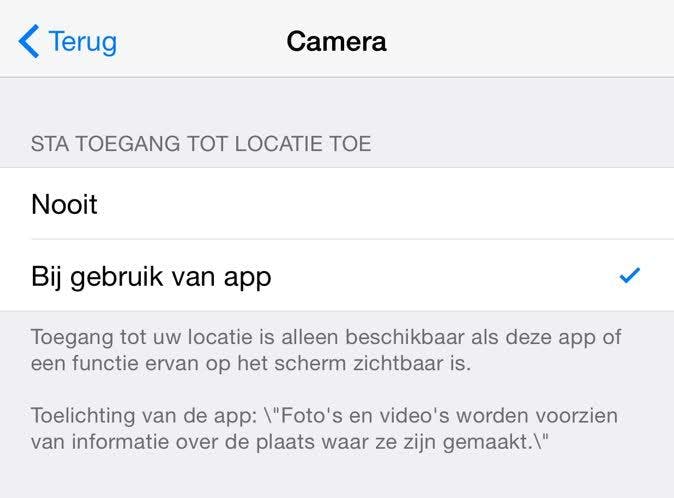 Als je deze locatiegegevens een inbreuk op je privacy vindt, kun je ze gewoon uitschakelen. Ga naar Instellingen / Privacy / Locatievoorzieningen / Camera. Als je Nooit aanvinkt, worden de locatiegegevens niet maar aan je foto's toegevoegd. Let erop dat de eerder opgeslagen foto's ongewijzigd blijven. Gebruik je een andere app om foto's te maken, verander dan ook daar de instellingen.