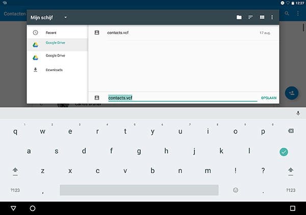 Ben je ingelogd met een Google-account, kies dan voor Google Drive, zodat je er eenvoudig op andere apparaten bij kunt. Kies voor Mijn schijf en tik op Opslaan. Op je pc ga je naar https://drive.google.com, alwaar je het net geëxporteerde bestand terugziet. Download het door erop te dubbelklikken en te kiezen voor Downloaden. Je hebt dan lokaal een kopie die je op allerlei diensten, waaronder Gmail, Outlook en iCloud kunt importeren. Kies dan voor het vCard-formaat.