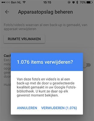 Handig is dat je daarna de foto’s lokaal van je apparaat kunt verwijderen, zodat je ruimte overhoudt. Hiervoor ga je naar Ruimte vrijmaken en tik je op de knop Ruimte vrijmaken. Je ziet hoeveel foto’s er lokaal verwijderd kunnen worden, omdat die al in de cloud staan.