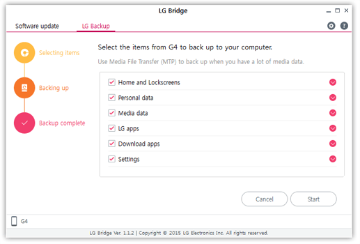 Dat zijn alle mogelijkheden van Google, die erg beperkt zijn omdat het lastig in te zien is wanneer de laatste back-up gemaakt is. Indien je een kopie van je smartphone of tablet op je pc wilt opslaan, is het nodig om de software van je telefoonfabrikant te gebruiken. Bijna elke fabrikant heeft hier wel software voor, zoals LG hieronder.