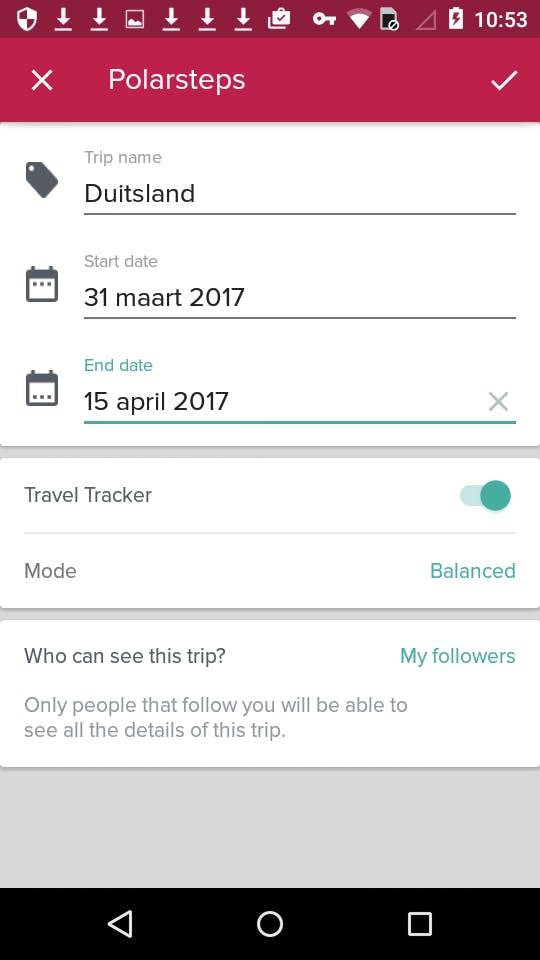 Een leuke app om je reis tijdens je vakantie bij te houden, is Polarsteps. De app is voor Android en iOS te downloaden en kost niets. Zodra je de app hebt geïnstalleerd, meld je je aan met je Facebook-account of met je e-mailadres. De app werkt het beste als het je locatie weet, dus tik op Enable location services als de app hierom vraagt. Geef een profielnaam op en tik op Done! om de registratie af te sluiten. Om een nieuwe reis toe te voegen, tik je op Add a trip. Geef een naam op en eventueel een start- en einddatum. Als je het schuifje achter Travel tracker aan laat staan, volgt de app je locatie. Ben je een dag ergens geweest waar je geen verbinding met internet had, dan raadt de app waar je je hebt bevonden. Op die manier kan het een aardig beeld maken van jouw route. Je kunt nog veel meer met de app, waaronder het bijhouden van een blog.