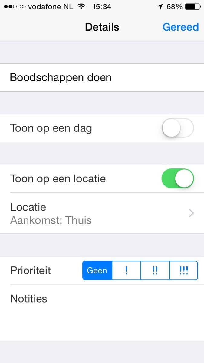 Stel, je bent op je werk en denkt er ineens aan dat je wasmiddel moet kopen. Het heeft weinig zin om een herinnering in te stellen voor een bepaald tijdstip, omdat de kans groot is dat je op dat moment niet direct naar de winkel zult rennen om wasmiddel te halen, waardoor je het daarna gewoon weer vergeet. Lees ook: Interactieve notificaties gebruiken op iPhone en iPad.
