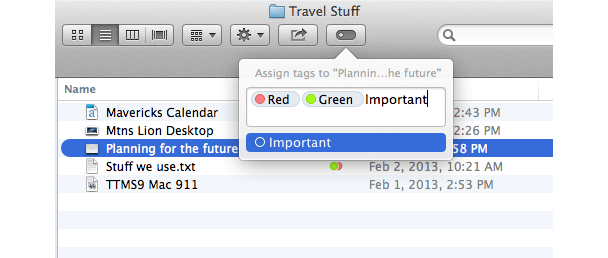 Het idee is dat je trefwoorden en gekleurde labels aan je bestanden en mappen kunt toevoegen. Dit klinkt misschien als de oude Labels en Finder Comments-functies. Ze zijn inderdaad aan elkaar verwant. Het verschil is dat je meer dan één gekleurd label aan een item toe kunt voegen, en de trefwoorden zijn veel duidelijker.
