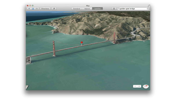 Maps: Als je ooit Maps op een iPhone, iPad, of iPod touch hebt gebruikt, zul je al goed bekend zijn met de Maps applicatie van Mavericks. Het bevat dezelfde elementen en functies. Je kunt de wereld (of een gebied zo klein als je lokale omgeving) bekijken met een traditionele kaartweergave, of een satellietfoto. En je kunt die (waarschijnlijk vanuit een vliegtuig genomen) satellietfoto's veranderen in een 3D-weergave waarmee je het landschap vanuit een hoek kunt zien.