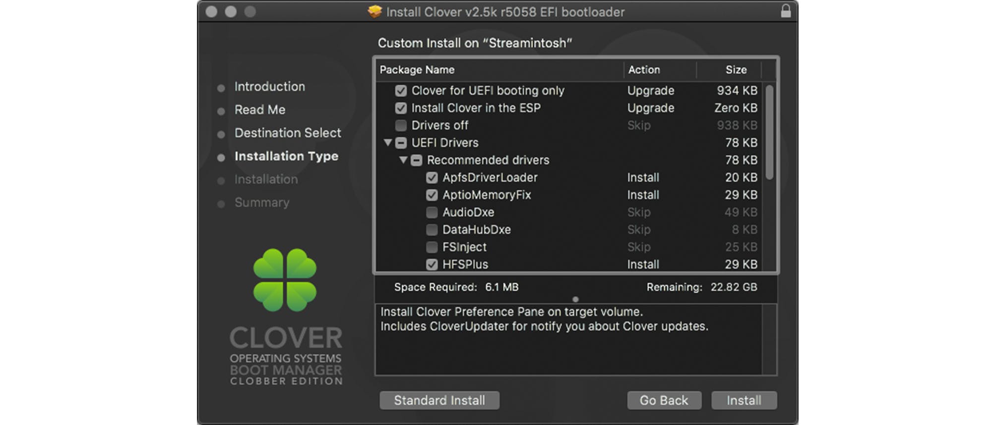 Download vervolgens de Clover-app. Hiermee gaan we de usb-stick aanpassen voor je Hackintosh en alle verzamelde kext-bestanden hierin verwerken. Zodra je Clover opstart, word je stapsgewijs langs alle opties geleid. Selecteer de usb-stick in kwestie en pas bij Installation Type een paar opties aan om je usb-stick te optimaliseren.