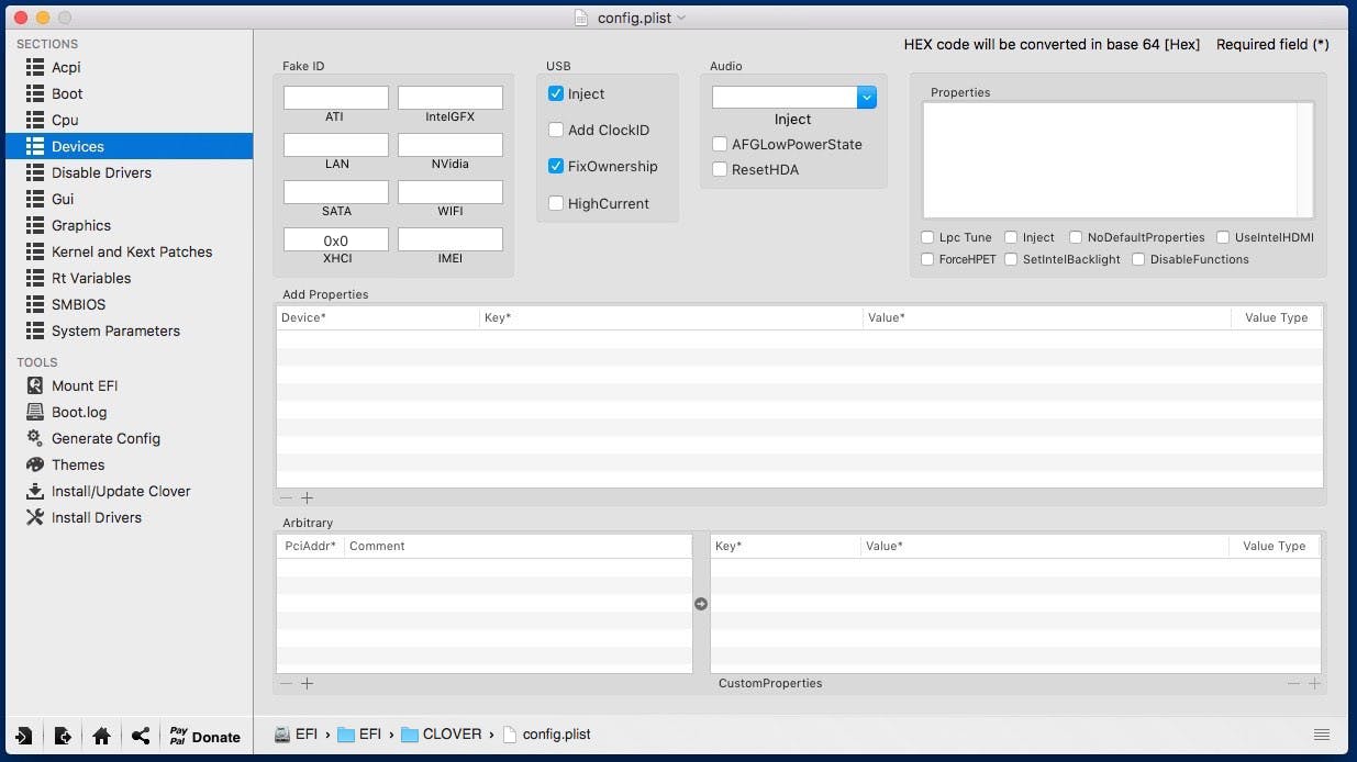 We zijn bijna klaar om te installeren, maar eerst passen we nog een paar kleine dingen aan. Download de Clover Configurator. Met dit programma kun je een configuratiebestand inladen dat je vindt op de eerder gemaakte usb-partitie. In de Clover Configurator open je het bestand op /Volumes/EFI/EFI/CLOVER/config.plist. De opties die je hier aanpast, bepalen hoe jouw specifieke hardware tijdens en na de installatie met de Mac praat.
