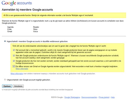 Eerst gaat u naar www.google.com/accounts en meldt u zich aan met het account dat voor u het belangrijkst is. Dit wordt het standaardaccount. Onder het kopje Persoonlijke instellingen klikt u bij Multiple sign-in op wijzigen. Omdat er wat haken en ogen aanzitten, wil Google dat u met vinkjes aangeeft dat u de mogelijkheden en beperkingen begrijpt. U moet hier dus zowel het keuzerondje bij Ingeschakeld als de vier vinkjes in het kader aanzetten en daarna klikt u op Opslaan. Dit hoeft u maar één keertje te doen.