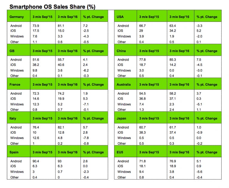 Android heeft in Europa het meest geprofiteerd van de daling van Windows Phone. In Europa steeg het marktaandeel met 5,1 procentpunt naar 71,8 procent. Voor iOS was die stijging slechts 0,9 procentpunt. In de VS was het juist iOS die hard steeg: van 29 procent marktaandeel naar 34,2 procent marktaandeel. Android verloor in de VS zelfs 3,3 procentpunt marktaandeel.