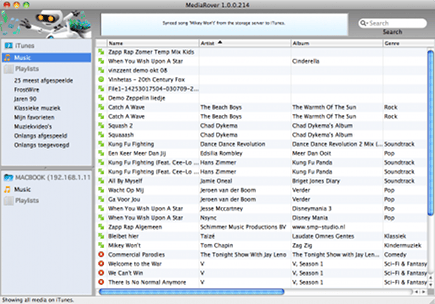 Het verbinden van de andere pc ging al even moeizaam. De ‘server’ (in dit geval een Mac waarop de muziek staat), werd niet gevonden, een direct IP-adres invullen werkte niet, en pas toen we de volledige naam ‘MACBOOK + IP-adres’ ingaven, in combinatie met de naam van de gedeelde map, ging het balletje rollen. Nu moet gezegd worden dat het dus ging om een combinatie tussen een pc en een Mac, maar dat moet probleemloos werken volgens de makers. Veel kritiek dus. Maar wanneer het zaakje eenmaal draait, werkt MediaRover fantastisch. Muziek in iTunes en iTunes-afspeellijsten worden probleemloos gedeeld, ook van ‘client’-computers naar de broncomputer. Aan de hand van de instellingen kunt u eenvoudig bepalen hoe de synchronisatie plaatsvindt (wat overschrijft wat?). Nadeel is wel dat de broncomputer aan moet blijven staan.