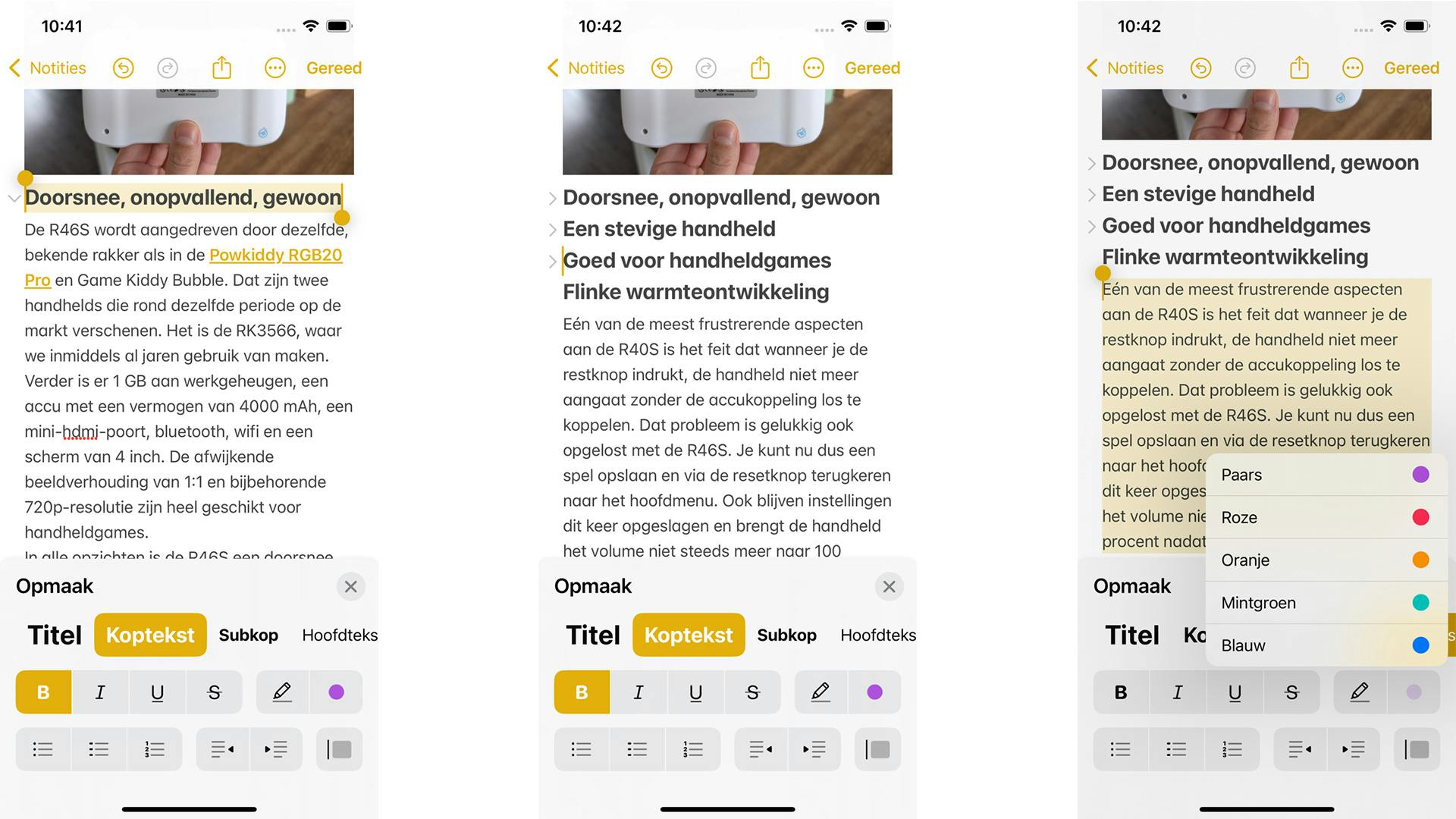 Tot slot is het mogelijk de tekst, in welke opmaakvorm dan ook, van kleurtjes te voorzien. Selecteer dan wederom een regel of alinea, tik als dat nodig is op plus, dan op Aa en tik rechts op de kleurknop (bij ons staat die standaard op paars).