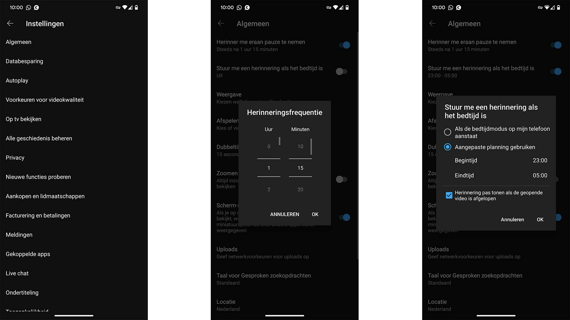 Soms neemt YouTube te veel tijd in beslag, en dat kan ten koste gaan van je slaap. Je kunt binnen de app herinneringen instellen die je erop wijzen eens pauze te nemen of te gaan slapen. Je gaat daarvoor naar je profielfoto binnen de app > Instellingen > Algemeen. Zet nu de schakelaar om bij Herinner me eraan pauze te nemen (de schakelaar moet blauw zijn). Stel een herinneringsfrequentie in en de app zal je na het verstrijken van de tijd een notificatie hierover sturen. Je kunt hetzelfde doen met Stuur me een herinnering als het bedtijd is; vergeet dan niet de correcte bedtijd in te stellen!