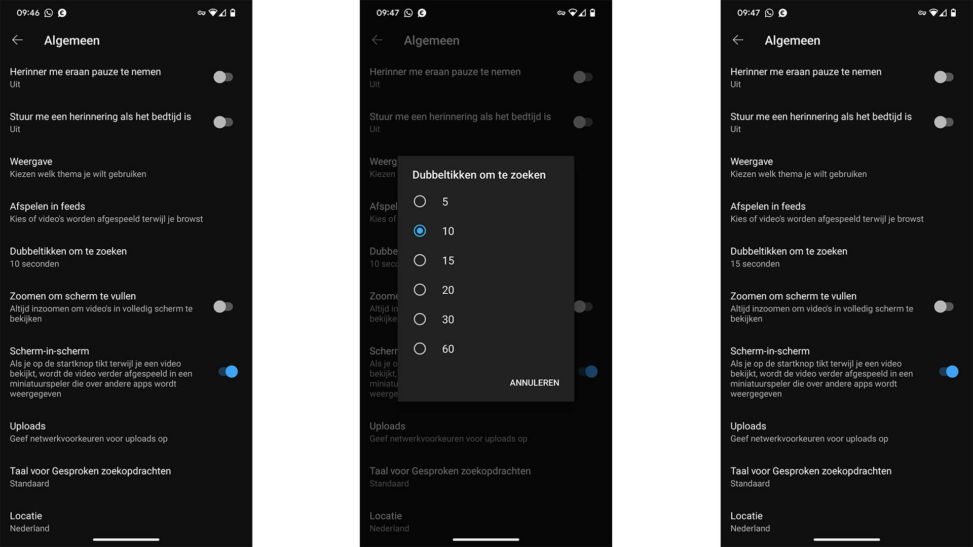 Mocht een video geen chapters hebben, dan kun je kun je ook twee keer tikken op het scherm om beetje voor beetje vooruit te spoelen. Normaliter gebeurt dat in stukjes van tien seconden. Maar wist je dat je die duur kunt aanpassen? Je gaat hiervoor naar de instellingen binnen de YouTube-app (tik op je profielfoto en selecteer Instellingen). Ga naar Algemeen en tik op Dubbeltikken om te zoeken. Je hebt nu de keuze uit vijf, tien, vijftien, twintig, dertig of zestig seconden. Selecteer het aantal seconden dat je prettig vindt. Vanaf dat moment is dat de duur van het vooruit spoelen.