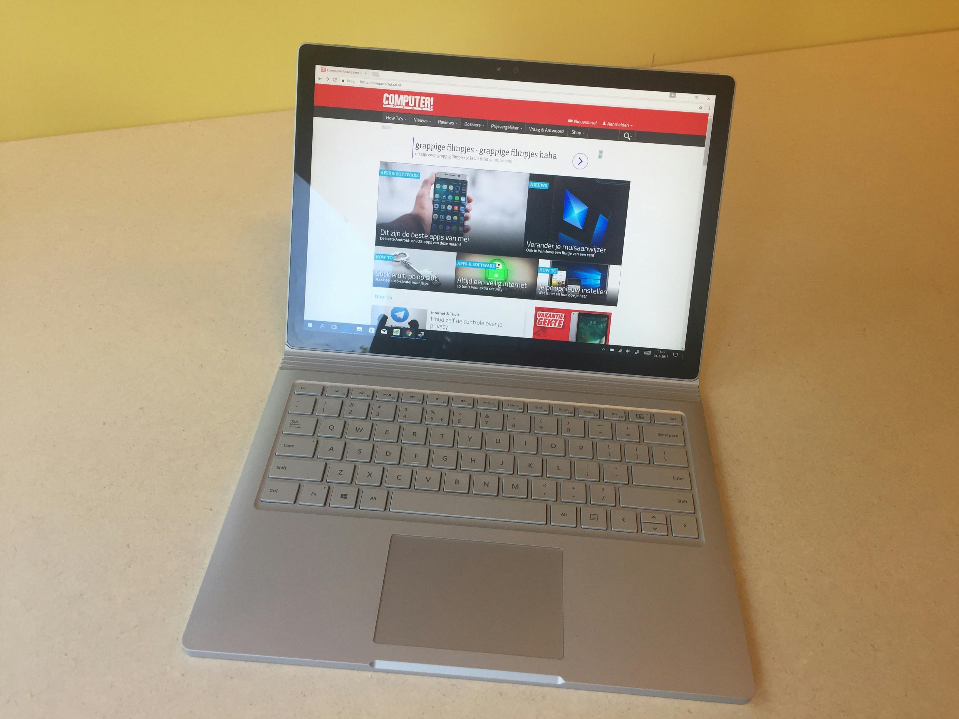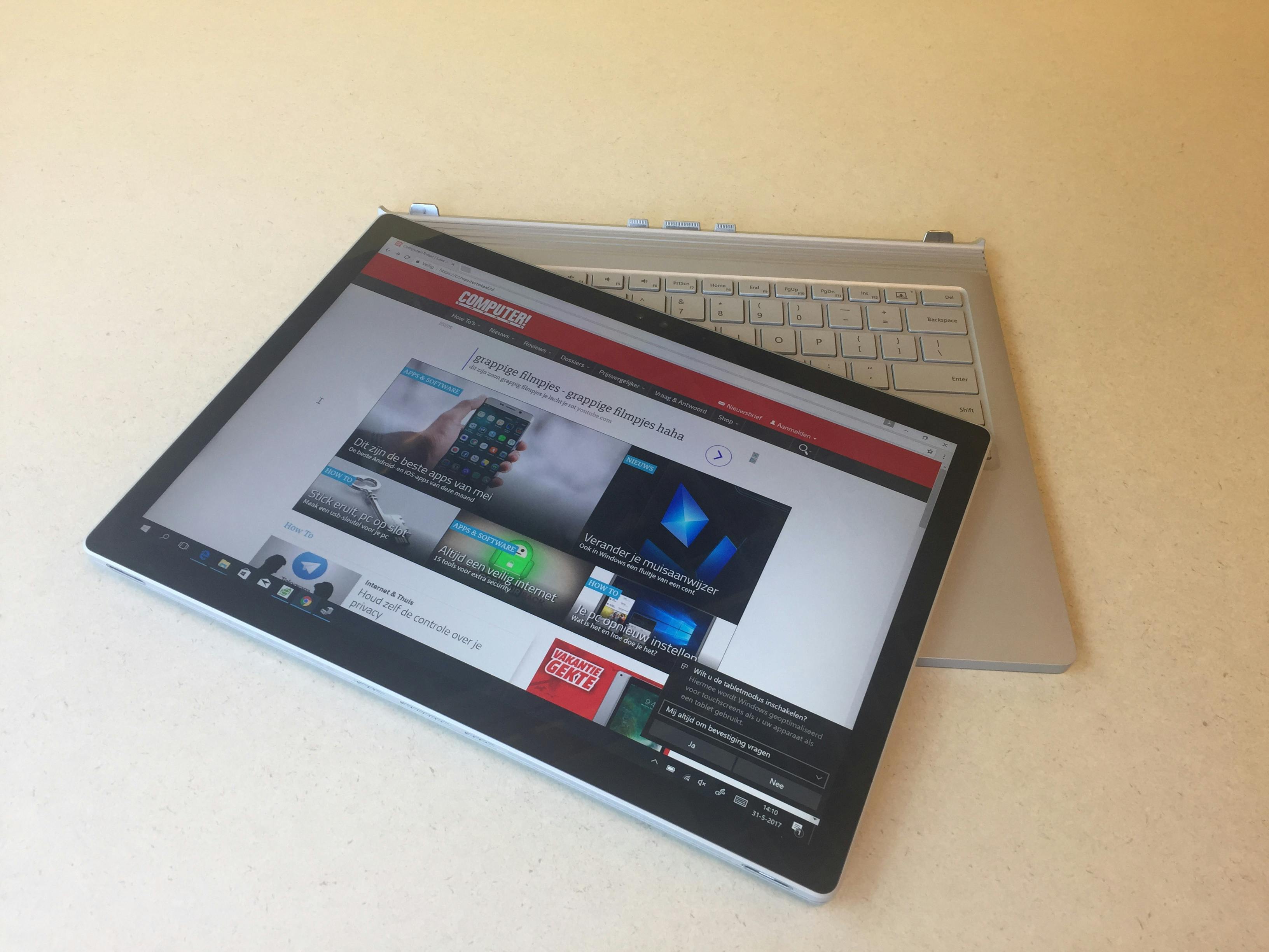 Hoewel de Surface Book net als andere Surface-apparaten een twee-in-één-apparaat is, is het stiekem meer Microsofts eerste laptop. Officieel gaat die eer natuurlijk naar de onlangs gelanceerde Surface Laptop. Je kunt het scherm namelijk wel als tablet gebruiken, maar met een accuduur van maximaal drie uur is dat wat ons betreft meer een extraatje. In de praktijk zul je het toetsenbord vermoedelijk altijd meenemen. Je hebt dan een moderne laptop gevat in een uitstekende behuizing met een fantastisch scherm en een lange accuduur. De prestaties zijn prima, maar het is jammer dat op een dure laptop (ons test model kost maar liefst 3649) een processor en gpu van de vorige generatie worden gebruikt.