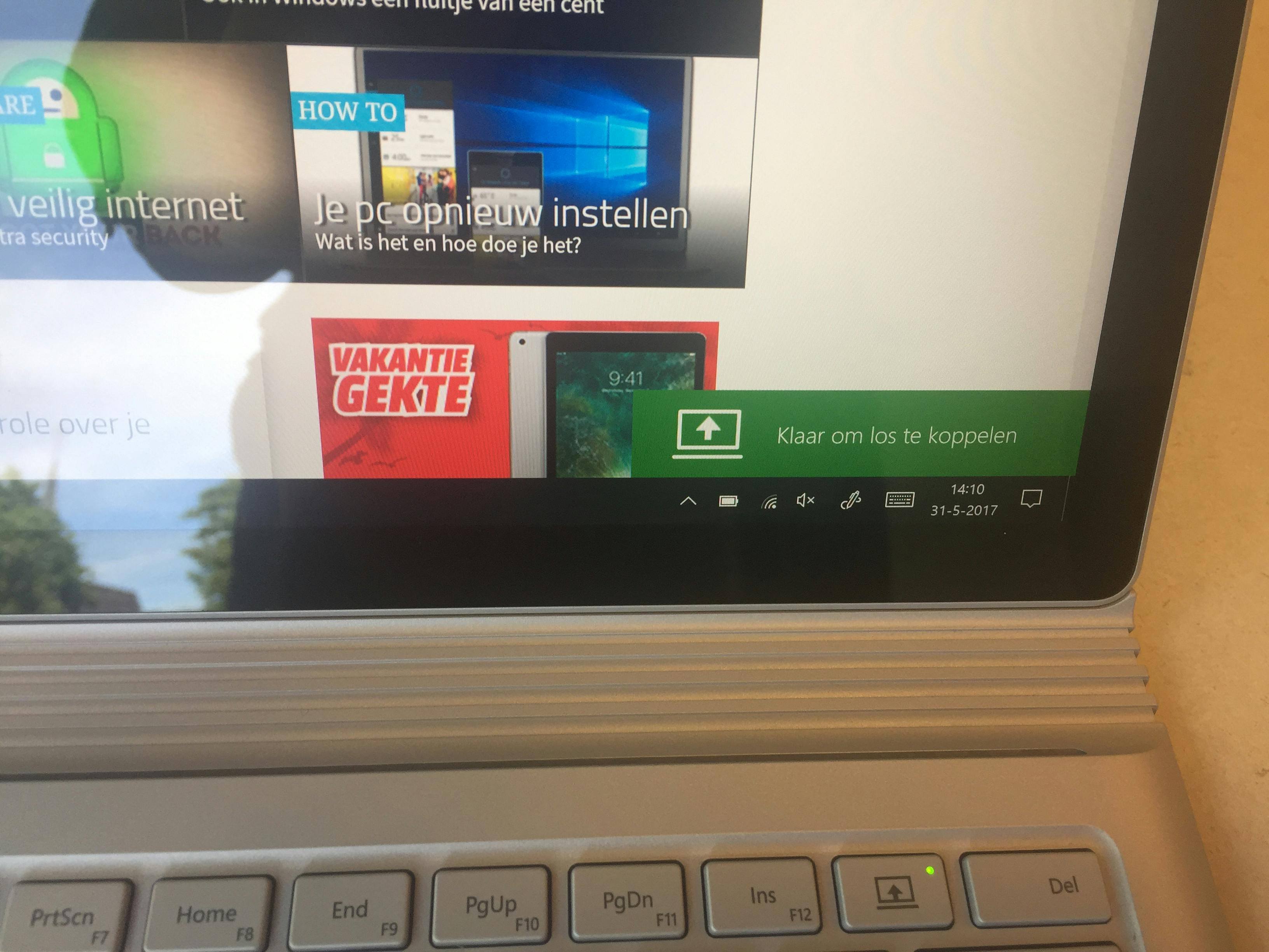 De Surface Book is zoals gezegd nog steeds een twee-in-één en je kunt het scherm dan ook van het toetsenborddock verwijderen. Zomaar trekken heeft geen zin, de tablet zit echt heel stevig vast. Pas nadat je een knopje op het toetsenbord indrukt, kun je de tablet lostrekken. Je krijgt een melding op het moment dat dit mogelijk is. Overigens kan dit alleen als de accu’s vol genoeg zijn, bij een te lage accucapaciteit is het loskoppelen niet langer mogelijk.