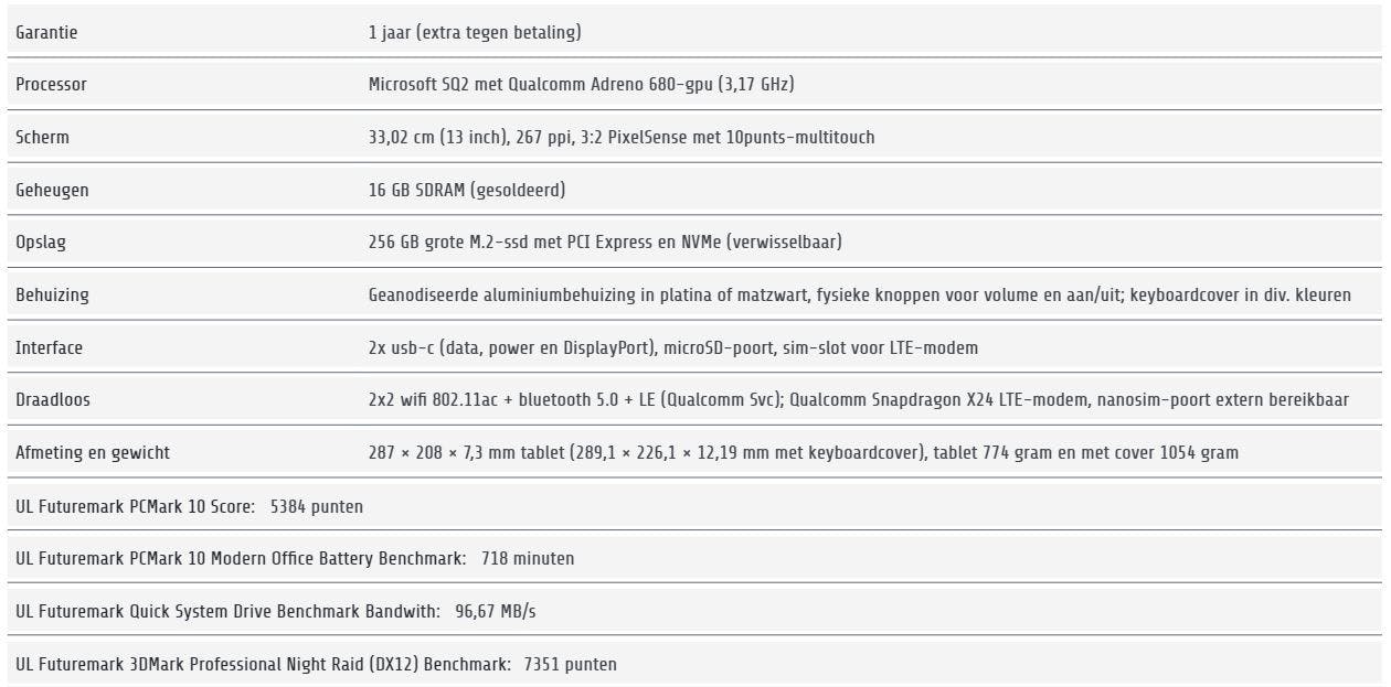 Met een gemeten stroomverbruik van iets meer dan 51 watt in de UL Futuremark 3DMark Professional Night Raid-benchmark is de ARM-variant van de Surface Pro niet energiezuiniger dan de vergelijkbare Intel-versie. De Surface Pro 7 verbruikt ongeveer hetzelfde in die benchmark en presteert bovendien iets sneller in de DX12 grafische benchmark.
