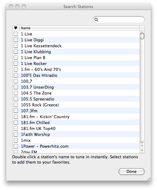 Alvorens u uw favoriete zender kunt afspelen, is het een goed idee om een kijkje te nemen bij de aanwezige zenders. Via Default Stations verschijnt er een lijst met meer dan 1200 zenders, gerangschikt op alfabetische volgorde. Hier kunt u zenders selecteren en deze worden dan opgeslagen als uw persoonlijke favorieten. Jammer genoeg zijn de zenders niet gerubriceerd op land, genre of kwaliteit, dit zou je toch wel verwachten van een betaald programma. De lijst met zenders wordt regelmatig geüpdatet, maar via het menucommando Custom Station kunt u zelf eenvoudig streams van online radiozenders toevoegen.