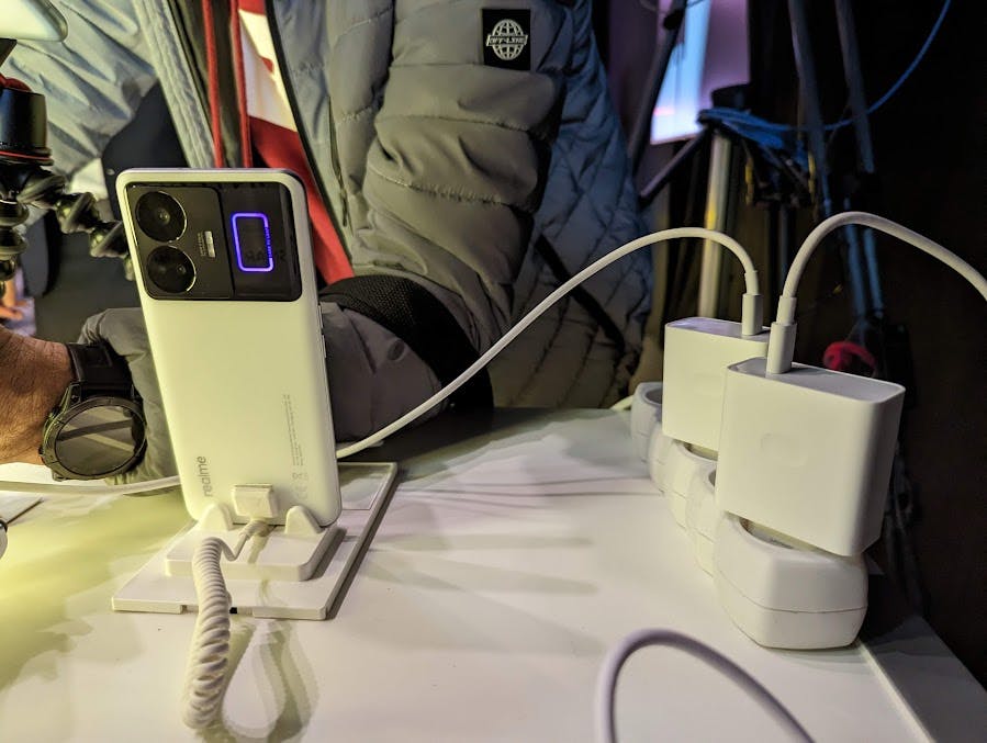 Realme, een zustermerk van Oppo en OnePlus, toont op MWC een smartphone die wel héél snel oplaadt. De nieuwe Realme GT3 met 4600mAh-accu doet er namelijk slechts 9,5 minuten over om van nul naar honderd procent op te laden. Dat komt door de zeer snelle (en overigens helemaal niet zo grote) 240 watt-oplader die in de doos zit. Er zijn geen smartphones die sneller kunnen opladen dan de Realme GT3, maar in de snel bewegende telecomwereld kan het oplaadrecord over een paar maanden zomaar alweer naar een ander toestel gaan.