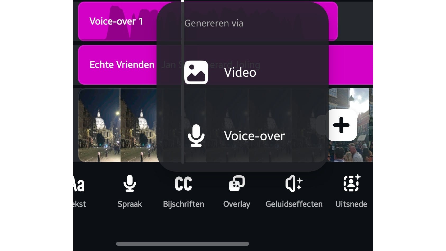Wil je een voice-over toevoegen? Je hoeft deze niet van tevoren op te nemen en naderhand onder de video te leggen. In plaats hiervan kun je de commentaarstem opnemen terwijl de video speelt. Voordeel is dat je zo beter kunt ‘timen’ en het verhaal ter plekke kunt afstemmen op het beeld. Tik op Spraak en tik op de opnameknop. De video begint te spelen, terwijl je de stem opneemt. Stop de opname en tik op het vinkje om de nieuwe audiolaag aan de montage toe te voegen.