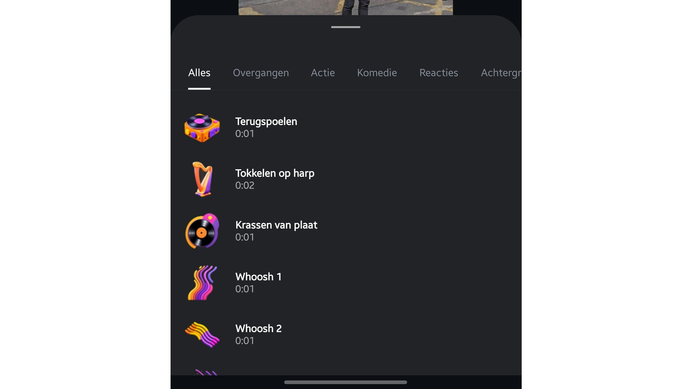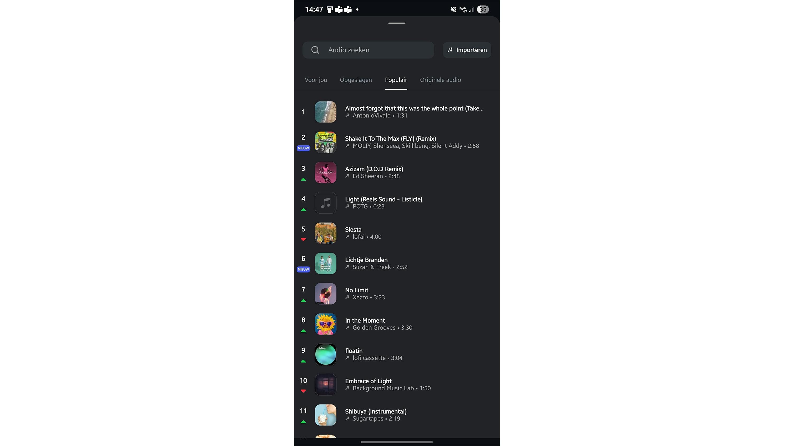 Handig is de tab Populair: deze bevat muziek die momenteel populair is en ervoor kan zorgen dat je eigen video hierdoor vaker wordt bekeken. De tab Originele audio bevat zelfgemaakte muziek door andere makers. Wil je liever eigen muziek gebruiken? Tik rechtsboven op de knop Importeren en wijs het mediabestand aan.