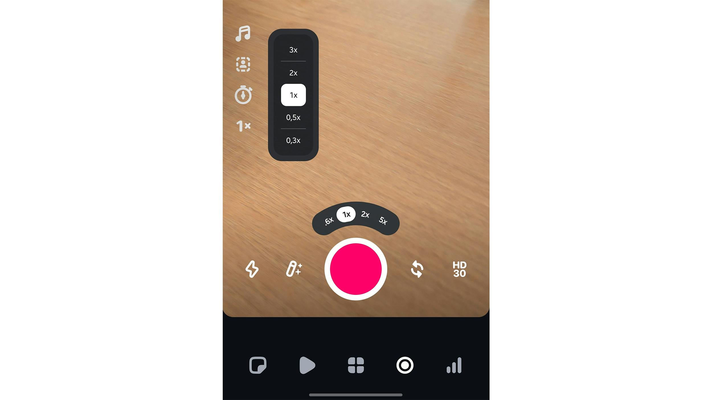 Onderin het scherm vind je de knoppen voor het maken van de opname. Boven de opnameknop kun je het zoomniveau instellen. Tot slot vind je naast de opnameknop de optie om van camera te wisselen (voor- en achterzijde) en de mogelijkheid om de resolutie en framesnelheid aan te passen.