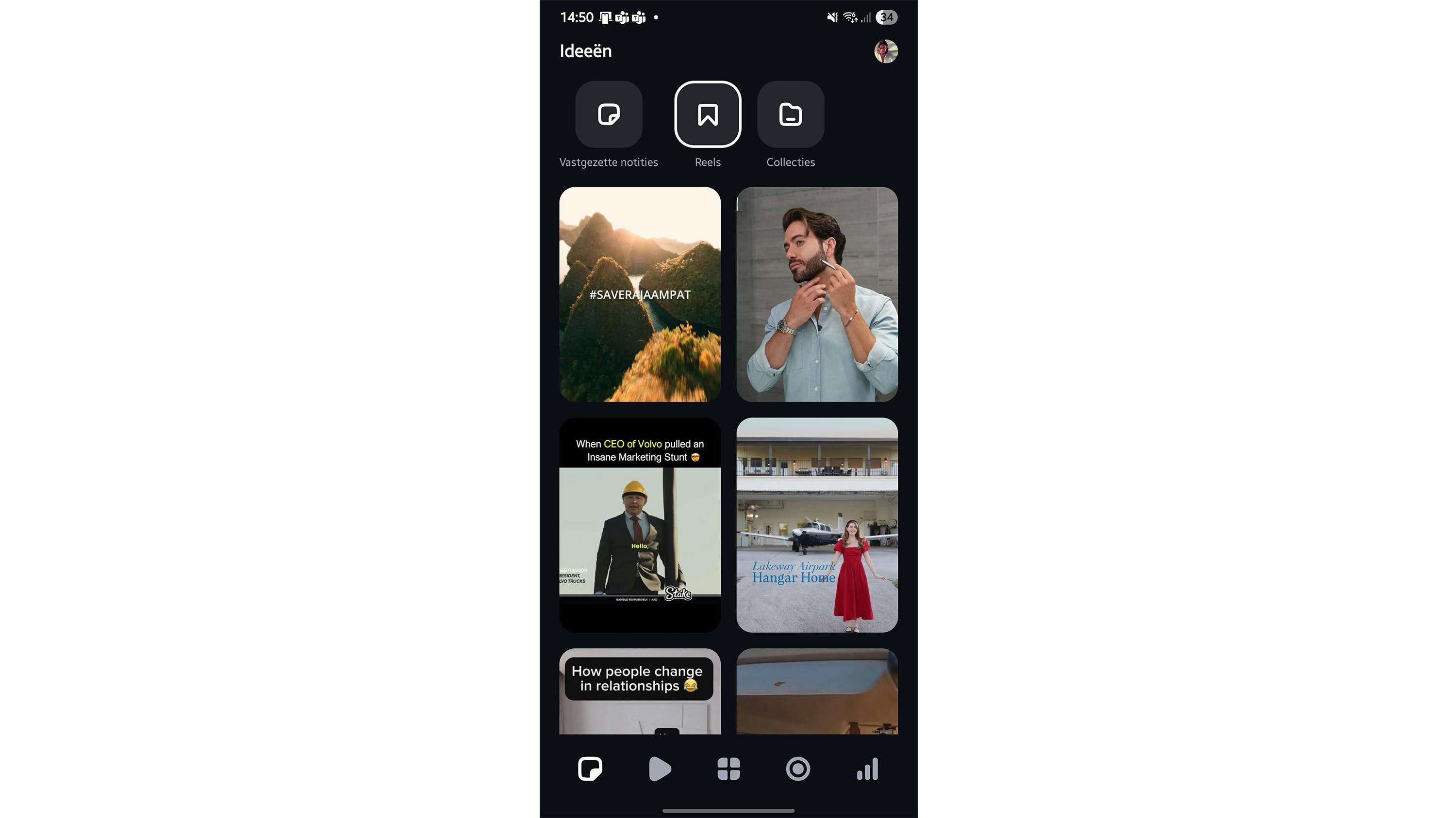 Na verloop van tijd kan de hoeveelheid reels flink toenemen. Je kunt structuur aanbrengen door reels in eigen collecties te bewaren. De collecties zijn toegankelijk via de gelijknamige knop rechtsboven in het scherm van Ideeën. Tik op een reel en houd je vinger op het scherm. Een nieuw venster verschijnt. Kies Toevoegen aan collectie. Via ditzelfde menu heb je toegang tot andere functies. Je kunt een aantekening toevoegen via Vastgezette notitie toevoegen. Verwijder een bestaande reel via Opslaan ongedaan maken.