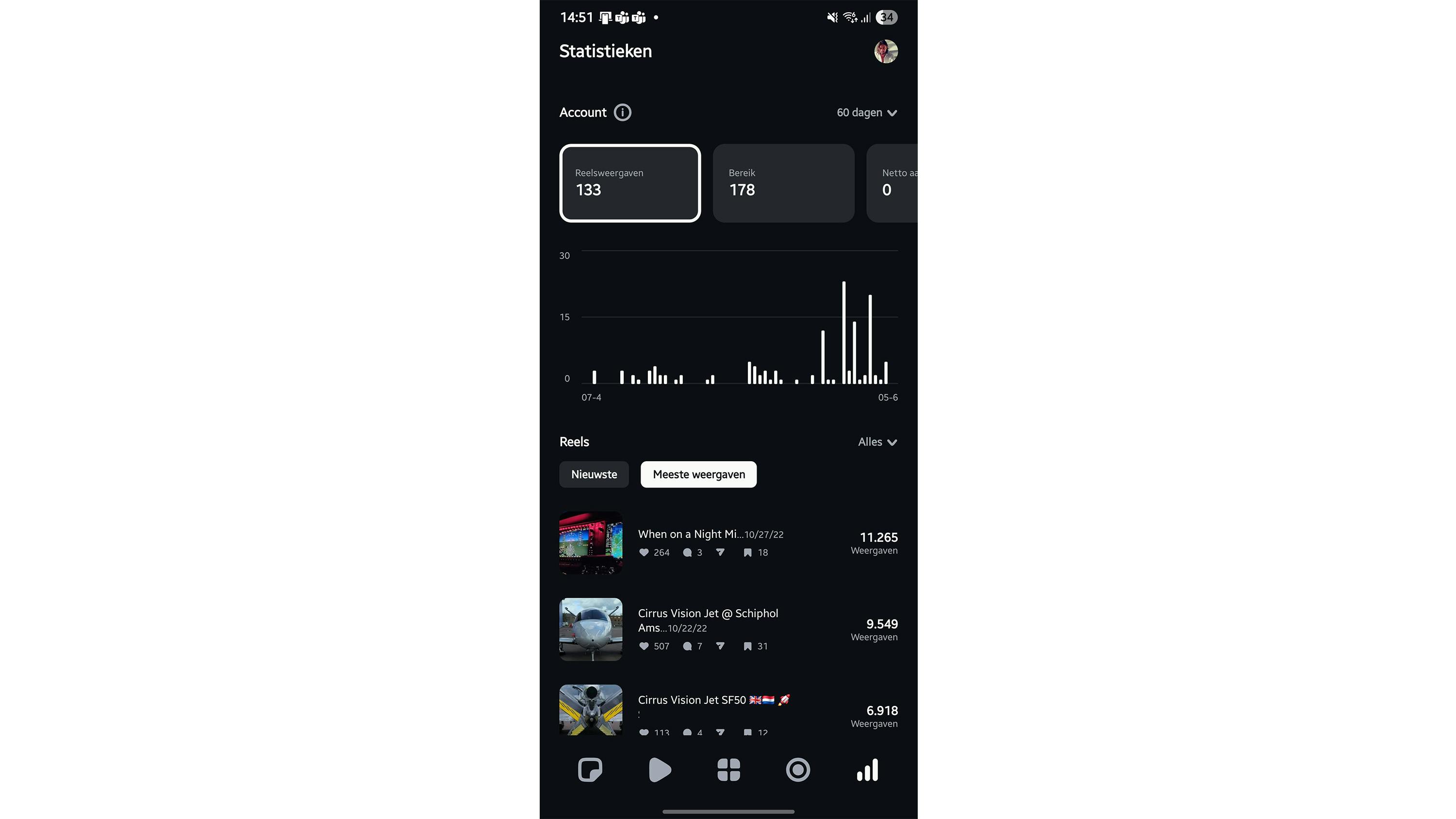 Als je je creatie hebt gemaakt en gedeeld met de buitenwereld, wil je uiteraard weten hoe deze presteert. Je kijkt hiervoor op de tab Statistieken. Kies eerst de periode rechtsboven, bijvoorbeeld 7 dagen of 60 dagen. Hierna kun je de statistieken bekijken per onderdeel. Tik bijvoorbeeld op Reelsweergaven om het totaal aantal weergaven over de tijd te bekijken.