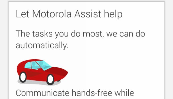 De Moto SmartActions-app van de voorgaande Motorola-telefoons is vervangen door een nieuwe, vereenvoudigde Moto Assist-app waarmee je alleen acties voor tijdens het autorijden, slapen of vergaderen kunt instellen. De telefoon detecteert wanneer je aan het autorijden bent en sms-berichten kunnen hardop worden voorgelezen. Bovendien kun je het geluid automatisch op bepaalde tijden uitschakelen. Hopelijk zullen er met updates meer functies worden toegevoegd.
