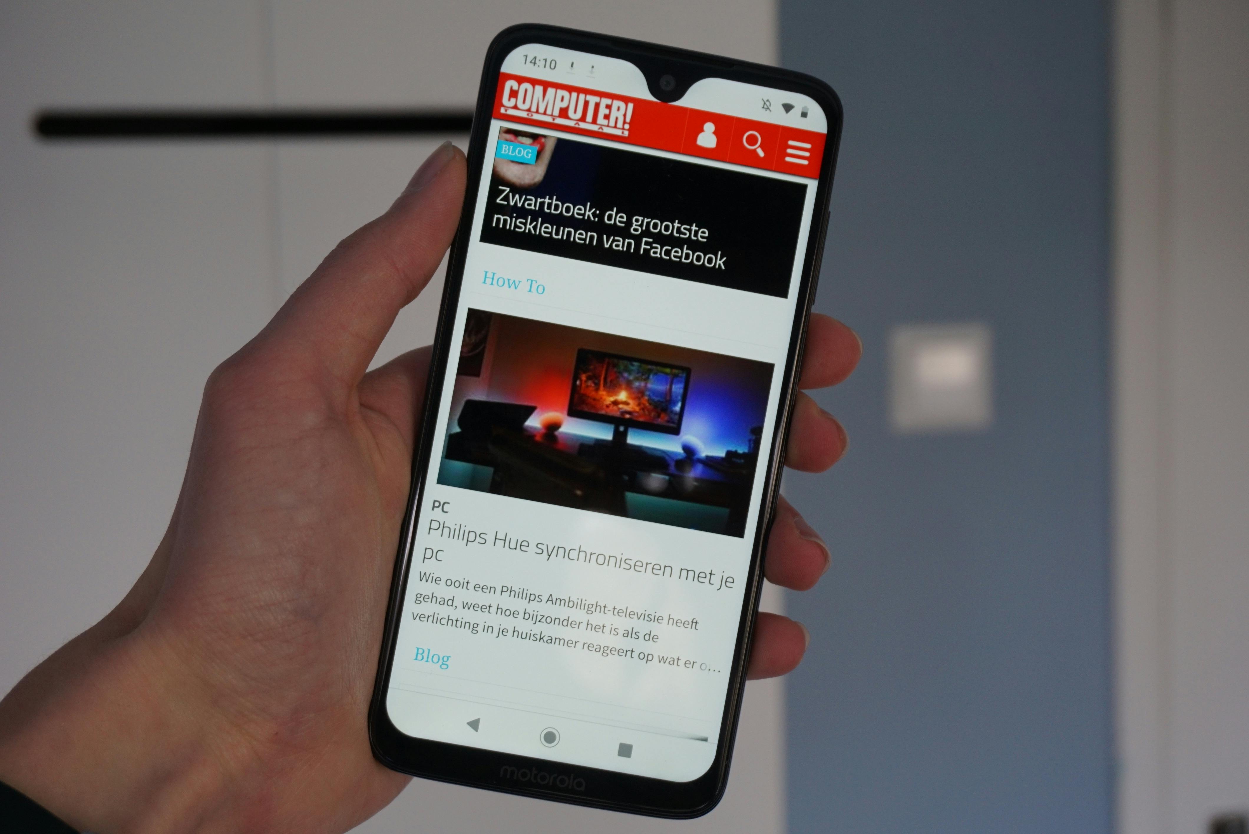 De achterkant van het toestel heeft een cameramodule die helaas flink uitsteekt. Dit kan je oplossen met – jazeker – een hoesje. Het Motorola-logo onder de camera bevat een vingerafdrukscanner die snel en accuraat is. De voorkant van de Moto G7 bestaat bijna helemaal uit scherm, wat de smartphone een modern uiterlijk geeft. Onderin zit een smalle rand met het Motorola-logo en bovenin vind je een smalle maar diepe inkeping voor de frontcamera. Het display is 6,2 inch groot en oogt scherp door de full-hd resolutie. Het lcd-scherm biedt mooie kleuren en de maximale helderheid is fel genoeg om het display af te lezen in een winterzonnetje. We vragen ons wel af of de helderheid toereikend is in de zomer.