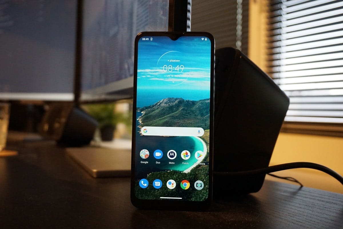 Het scherm meet 6,5 inch en is daarom lastig met één hand te bedienen. Door de hd-resolutie oogt het beeld redelijk scherp, al zie je wel verschil met toestellen die een full-hd-scherm hebben. Het scherm ziet er verder prima uit en heeft een inkeping voor de selfiecamera. Een aandachtspunt is dat de Moto G9 Play een grote smartphone is die niet in alle strakke broekzakken past. Met 200 gram is hij ook zwaarder dan de gemiddelde telefoon, wat deels te verklaren is door de grote accu.