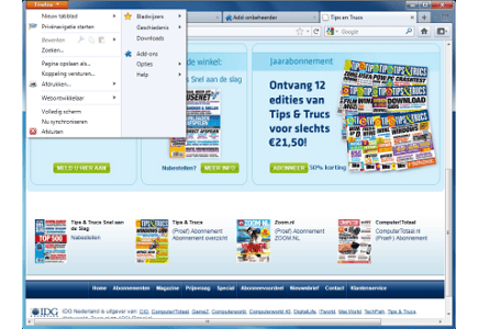 In versie 4 is de interface van Firefox helemaal omgegooid. Zo zijn de menu- en bladwijzerwerkbalk verdwenen, waardoor de tabbladen een prominentere plaats boven de navigatiewerkbalk krijgen. Kunt u daar niet aan wennen en wilt u de tabbladen op hun 'oude' plek onder de navigatiewerkbalk zien, dan haalt u in het menu Opties het vinkje weg bij Bovenliggende tabbladen. Wat ook onmiddellijk opvalt in de nieuwe interface, is dat de menubalk is vervangen door de oranje Firefox-knop bovenaan. Als u hierop klikt, krijgt u de inhoud van het menu te zien. Wil u de ouderwetse menubalk terug? Vink Menubalk aan in het menu Opties. In ditzelfde menu kunt u ook de bladwijzerwerkbalk weer inschakelen. Ten slotte is ook de statusbalk verdwenen in Firefox 4. Om deze terug te krijgen, vinkt u Add-onbalk aan in het menu Opties.