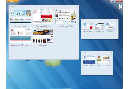 Als u veel tabbladen hebt openstaan, verliest u al snel het overzicht. In Firefox 4 kunt u gelukkig wat orde op zaken stellen door uw tabbladen te groeperen. Klik helemaal rechts naast de tabbladen op het omgekeerde driehoekje en dan op Tabbladgroepen (of druk op Ctrl+Shift+E). Firefox toont vervolgens in een kader de miniatuurversies van alle geopende tabbladen. Standaard worden ze in één groep geopend, maar door een miniatuur buiten het kader te verslepen, maakt u een nieuwe groep met dat tabblad aan. Als u op de miniatuur klikt om de tabgroep te openen, toont Firefox enkel dit tabblad.