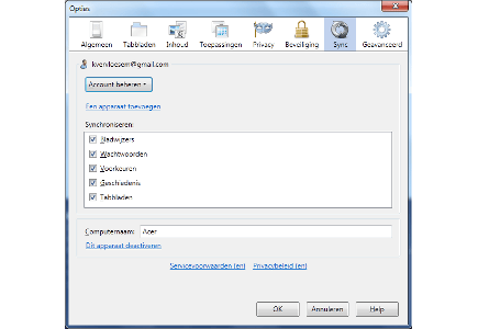 Op de andere computer (of op uw Android-telefoon) stelt u daarna ook Sync in, maar daarbij selecteert u de optie die aangeeft dat u al een Firefox Sync-account hebt. Daarna krijgt u drie korte codes van vier tekens te zien. Open nu opnieuw de Sync-opties op het eerste apparaat en klik op Een apparaat toevoegen. Vul er vervolgens de drie codes in die u op het tweede apparaat ziet. De gegevens van beide computers worden nu gesynchroniseerd, een klus die de eerste keer aardig wat tijd in beslag kan nemen. De tabbladen worden overigens niet letterlijk gesynchroniseerd, u krijgt 'gewoon' toegang tot de geopende tabbladen op andere apparaten in het menu Geschiedenis / Tabbladen van andere computers.
