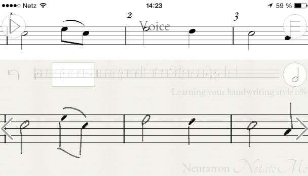 NotateMe Now is de gratis versie van het verbluffende NotateMe. Met de app kun je heel eenvoudig digitale partituren maken van jouw handschrift. Onderin zie je je handgeschreven noten, bovenin hoe NotateMe Now dit heeft omgezet. Als je klaar bent, kun je je partituur in MIDI- of XML-formaat opslaan. Om een bestand als pdf-bestand op te slaan, moet je wel de volledige versie voor 35,99 euro aanschaffen.