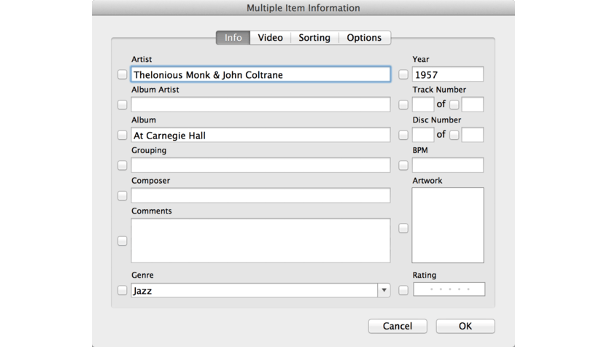 Jazz, shownummers, soundtracks: Naast het bovenstaande, kan het een goed idee zijn om meer informatie over je muziek in te voeren. De Album Artist tag is een belangrijke voor deze muzikale varianten. Voor dat Thelonius Monk Quartet met John Coltrane in Carnegie Hall album, bijvoorbeeld, heb je een aantal opties. Je zou Artist kunnen invullen als Thelonius Monk of als Thelonius Monk en John Coltrane. En je zou Album Artist kunnen invullen als Thelonius Monk, The Thelonius Monk Quartet, of Thelonius Monk en John Coltrane. Of je kunt het Album Artist veld leeg laten. Het hangt er helemaal van af hoe je een dergelijk album classificeert. Is het een Monk album waar John Coltrane aan meedoet, of is het een album van Monk en Coltrane samen?