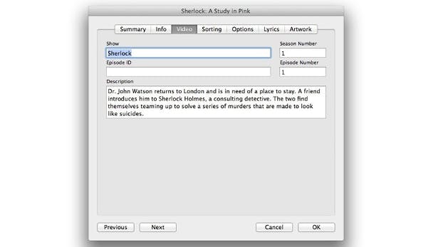 Films en TV-series: iTunes heeft specifieke tags voor video's in het tabblad Video in het Info venster. Voor TV-series vul je de naam van de serie, het nummer van het seizoen, en het nummer van de aflevering in. Het is op die manier veel gemakkelijker om met een Apple TV door series die meerdere seizoenen hebben te navigeren. Films hebben dergelijk informatie niet nodig, maar je kunt details over de film toevoegen in het Description veld in het tabblad Video. Helaas zijn er geen Director of Actor tags voor films. Maar je kunt deze in het Artist veld neerzetten, en als je specifieke acteurs wilt invoeren kan dat in het Comments veld in het tabblad Info.