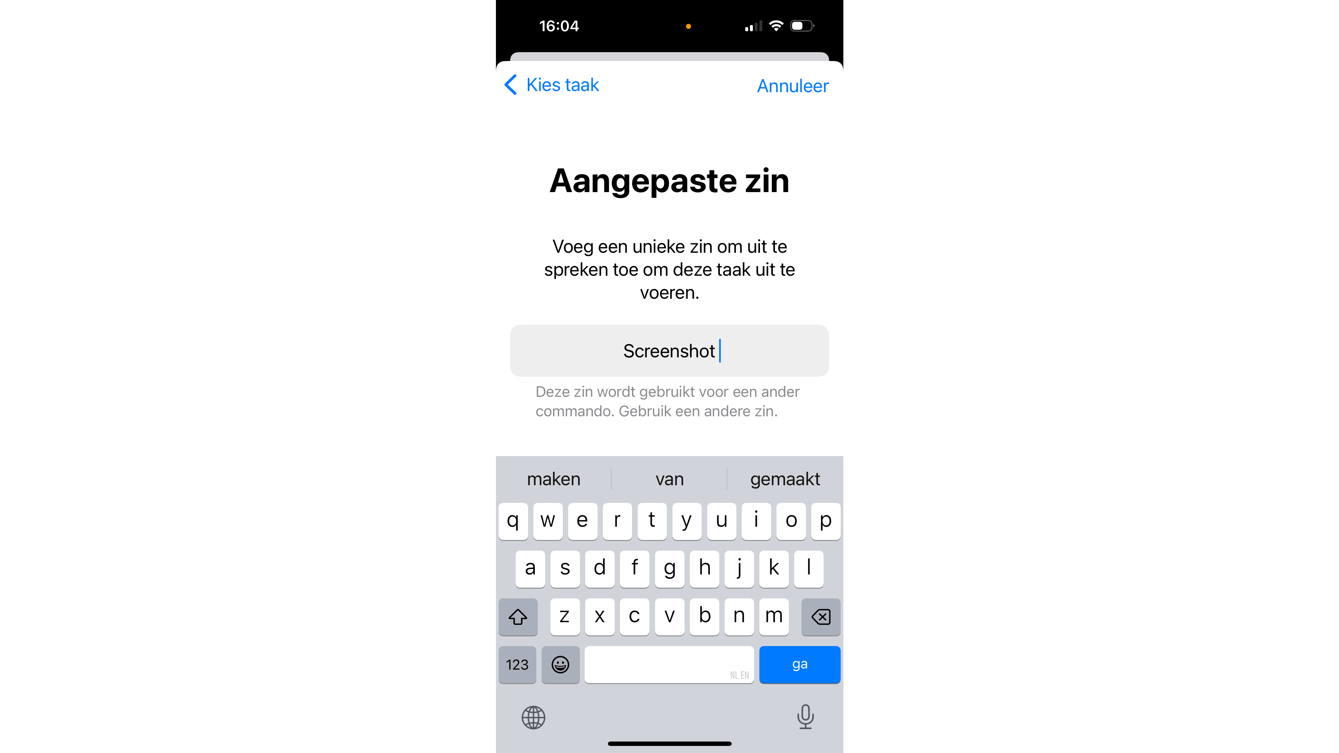 Voordat je stembediening inschakelt, zorg je dat je iPhone verbinding heeft met internet. Als alles straks geconfigureerd is, heb je geen internetverbinding meer nodig. Ga naar Instellingen / Toegankelijkheid, zodat je bij Spraakopdrachten komt. Schakel Spraakopdrachten in door het schuifje groen te maken. Vervolgens kom je in het scherm Configureer gesproken opdrachten. Tik op Ga door. Nu start een bestandsdownload. Als die klaar is, ga je verder. Om alvast even te proberen, scrol je door de opdrachten en kies je er eentje, bijvoorbeeld Schermafbeelding. Tik op deze opdracht. In het scherm Aangepaste zin typ je de naam van deze opdracht. In ons voorbeeld kiezen we het woord Screenshot als commandonaam.