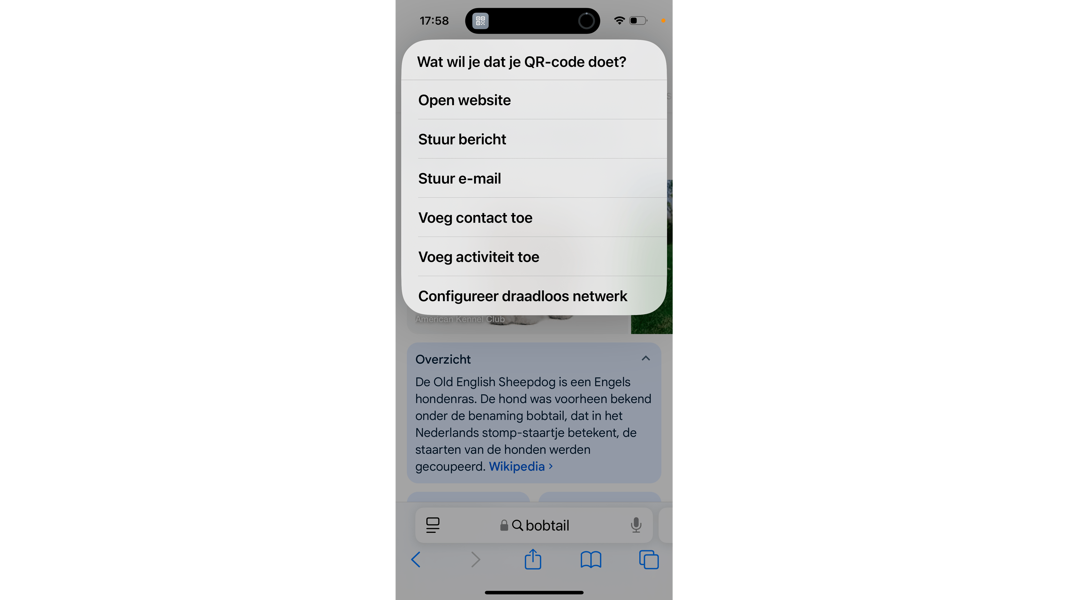Soms moet je na zo’n spraakopdracht nog extra handelingen uitvoeren, zoals bij: Maak QR code aan. Tik op Voeg taak toe en bij de opdrachten kies je Maak QR-code aan. Vervolgens geef je het commando een naam en spreek je de opdracht uit. Wanneer je bijvoorbeeld een website bezoekt en je zegt Maak QR-code, dan zal de iPhone vragen wat je met die QR-code wilt doen: een website openen, een bericht versturen, een e-mail versturen, een contact toevoegen, een activiteit toevoegen of een draadloos netwerk configureren.